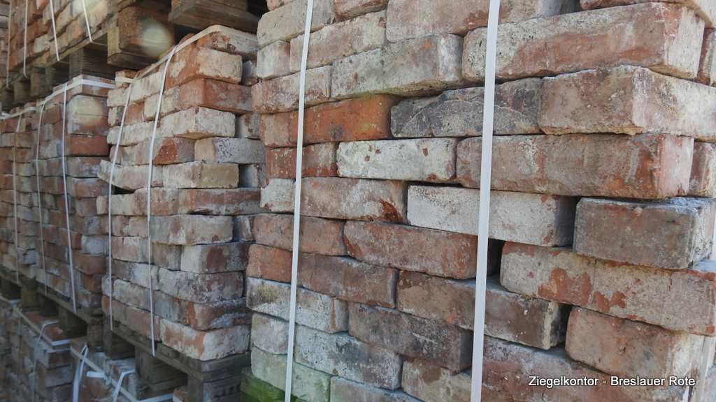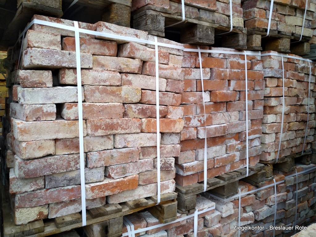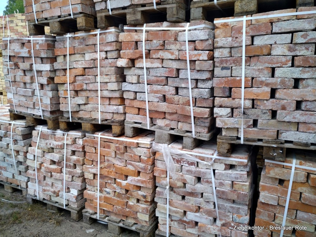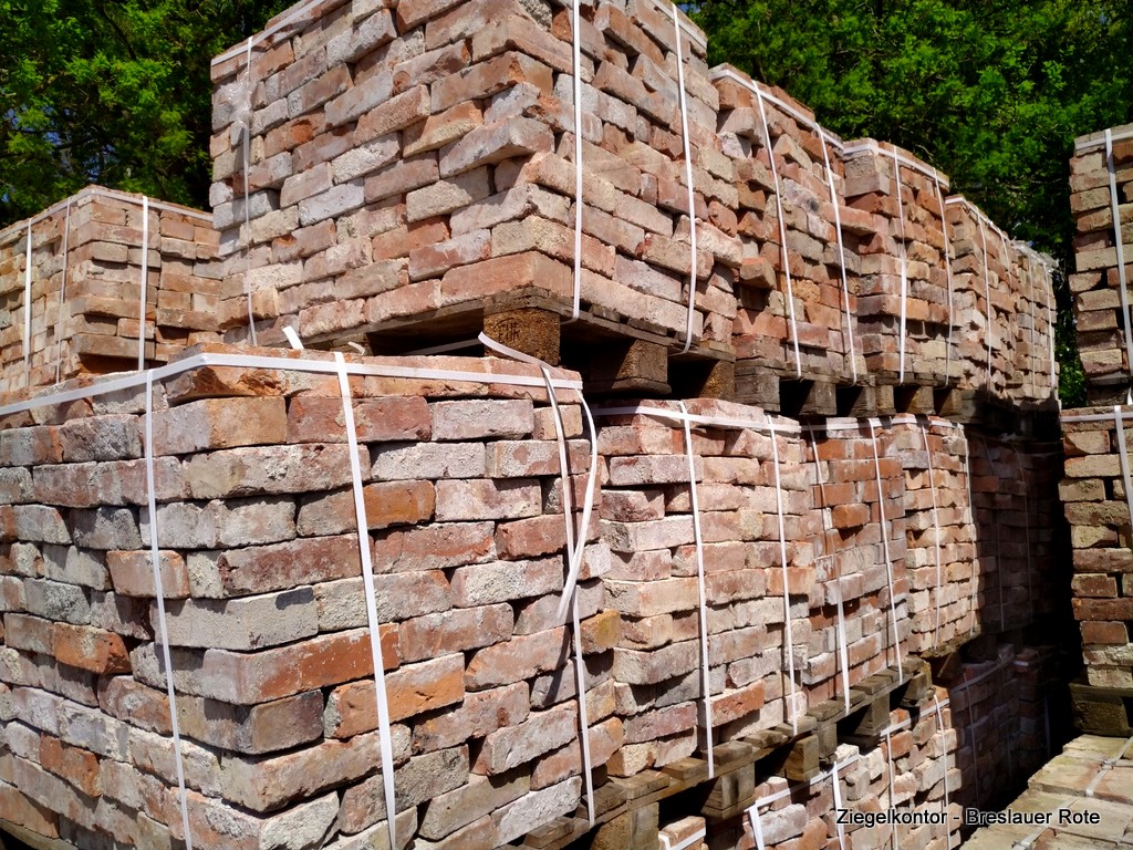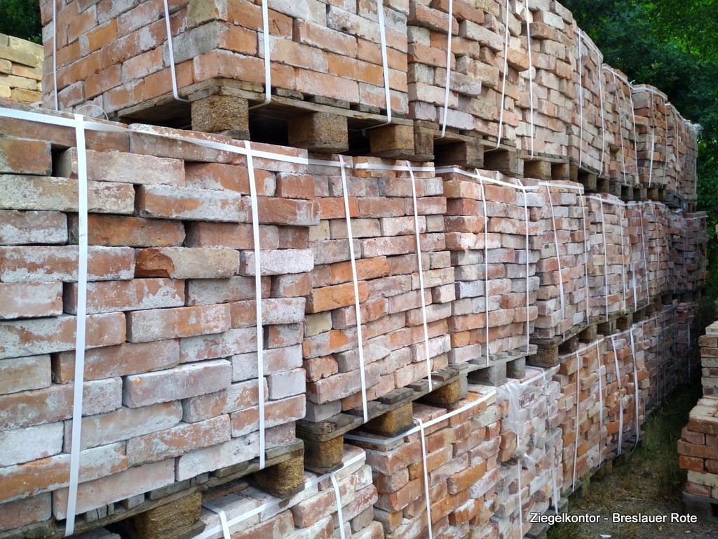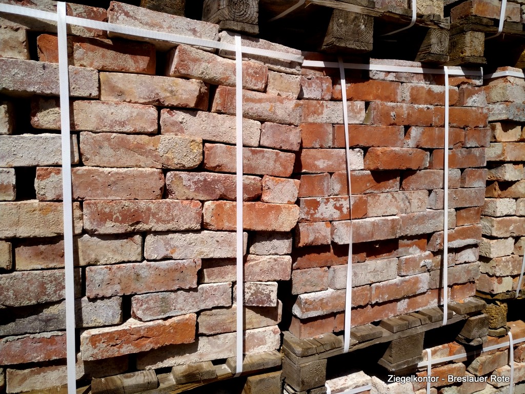 Schroffer, rotbunter, stranggepresster Reichsformat-Ziegeln aus dem Rückbau historischer Bausubstanz im Raum Breslau.