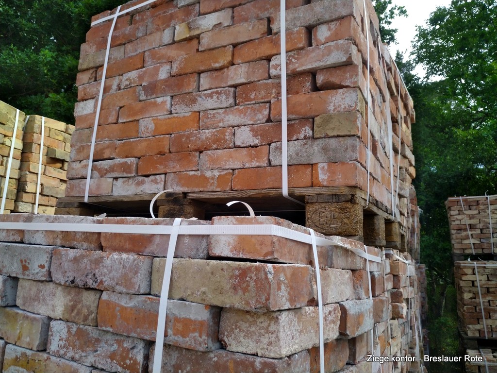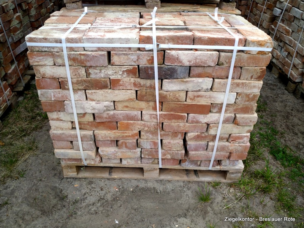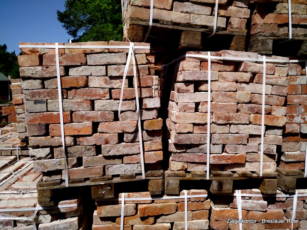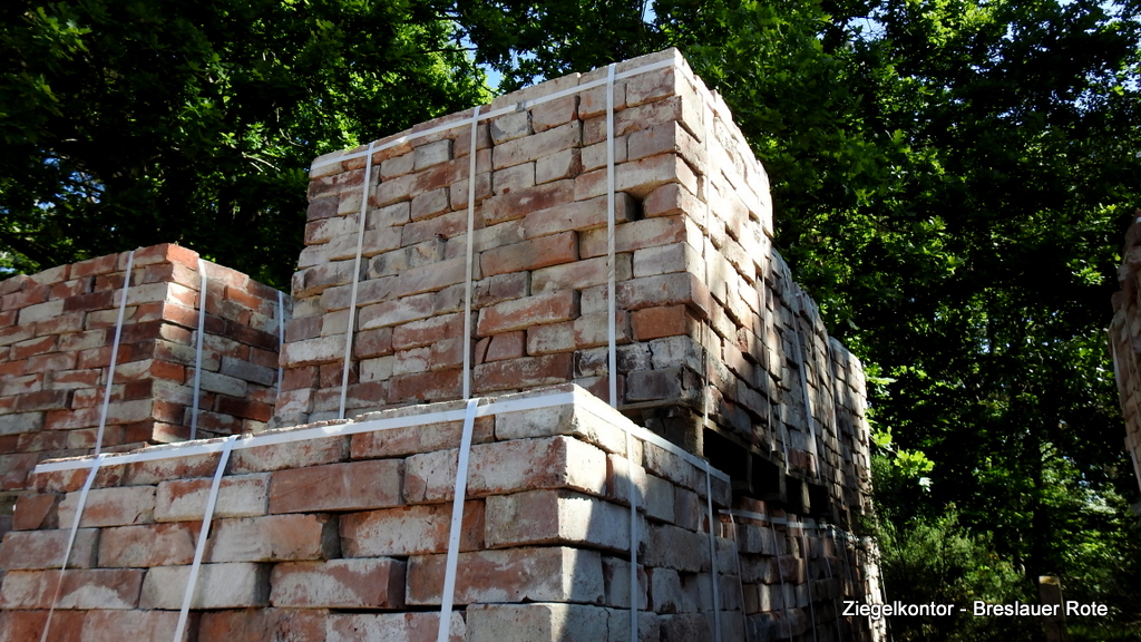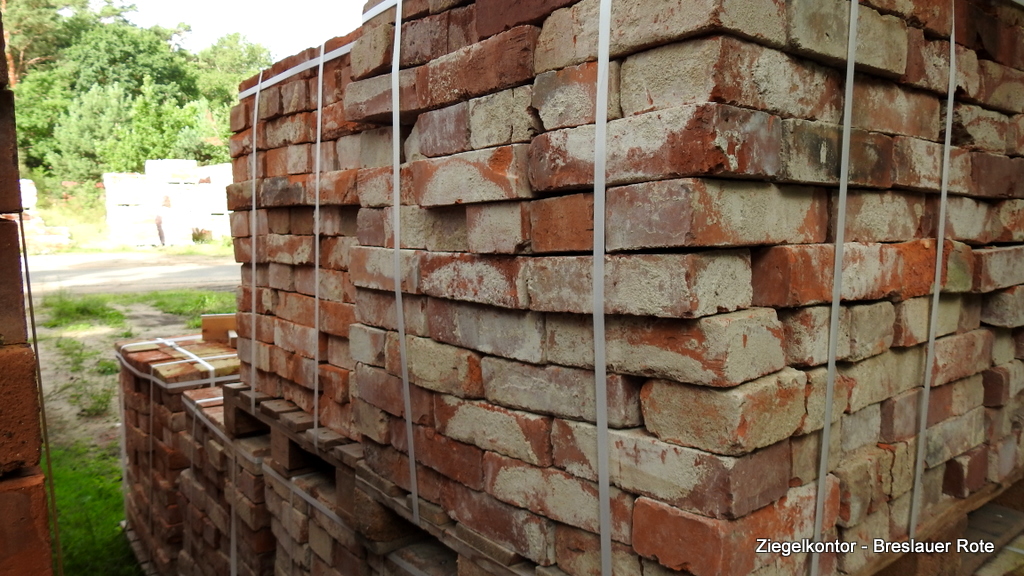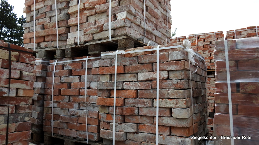 Schroffer, rotbunter, stranggepresster Reichsformat-Ziegeln aus dem Rückbau historischer Bausubstanz im Raum Breslau.